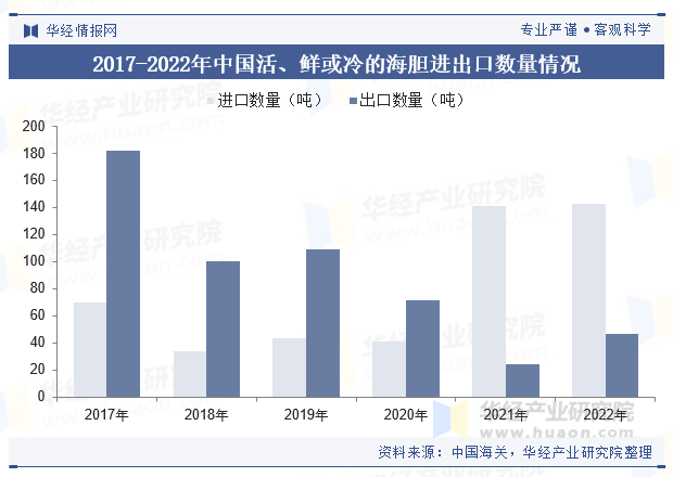 近年来,我国的活、鲜或冷的海胆(种苗除外)的进、进口数量曲线上涨,出口数量则呈低走态势;2022年的中国活、出口数量别离为143。09吨、46。77吨。