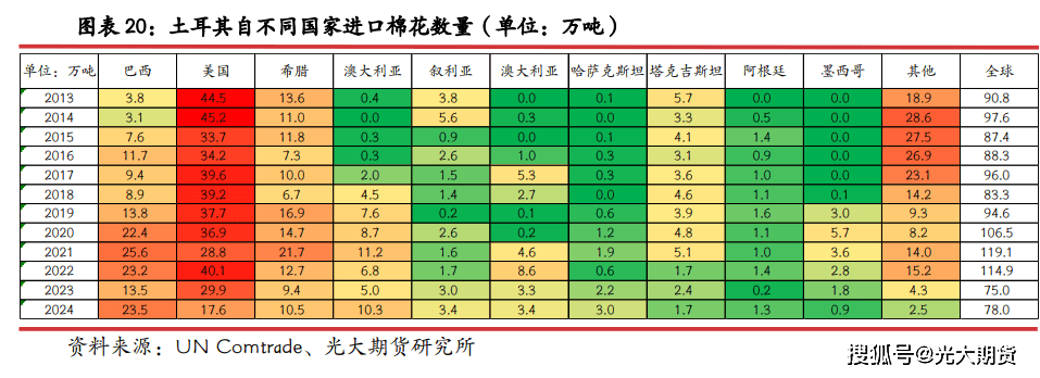 土耳其次要从巴西和美国进口棉花,自希腊和也有较大数量棉花进口,近年来自美国进口占比逐步下降,自巴西进口占比逐步添加,2024 年进口澳棉数量也有较着增量。土耳其棉花年进口量大约正在 75-120 万吨之间,2023 年之前,美都城是土耳其最大的棉花进口来历国,年进口美棉数量根基不变正在 35-45 万吨之间,占土耳其年棉花进口量 35-50%。2024 年巴西跨越美国成为土耳其最大的棉花进口来历国,2024 年土耳其进口巴西棉 23。5 万吨,占总进口量比例30%,自美国进口 17。6 万吨,占比 22。6%,自美国进口棉花数量及占比均创下近 10 年来新低。希腊也是土耳其较为次要的棉花进口来历国,二国连接,运输相对便当,一般环境下,土耳其每年要从希腊进口超 10 万吨棉花,占土耳其棉花年进口量约 10%。2024 年进口澳棉数量大幅增加,为 10。3 万吨,占总进口量比例初次跨越 10%。2024 年土耳其进口美棉数量下降,自其余次要进口国进口量响应添加。(注:3。1 部门中,数据来历 UN Comtrade,年度为天然年度,统计口径为海关编码 HS5201 取HS5203 数据之和)